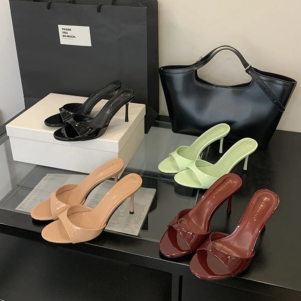 2025 Summer New Fashionable European American Thin High Heeled Sandals Slippers Green Red for Women-0