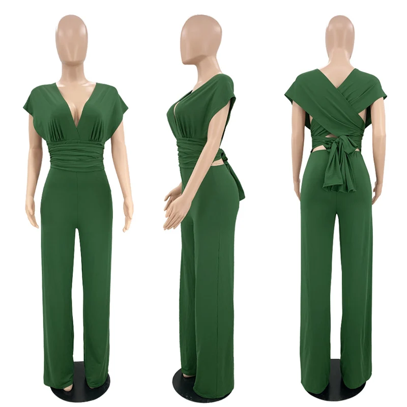 C240080 Elegant V Neck Lace up Jumpsuit Wide Leg Waisted Formal Jumpsuit Women-11