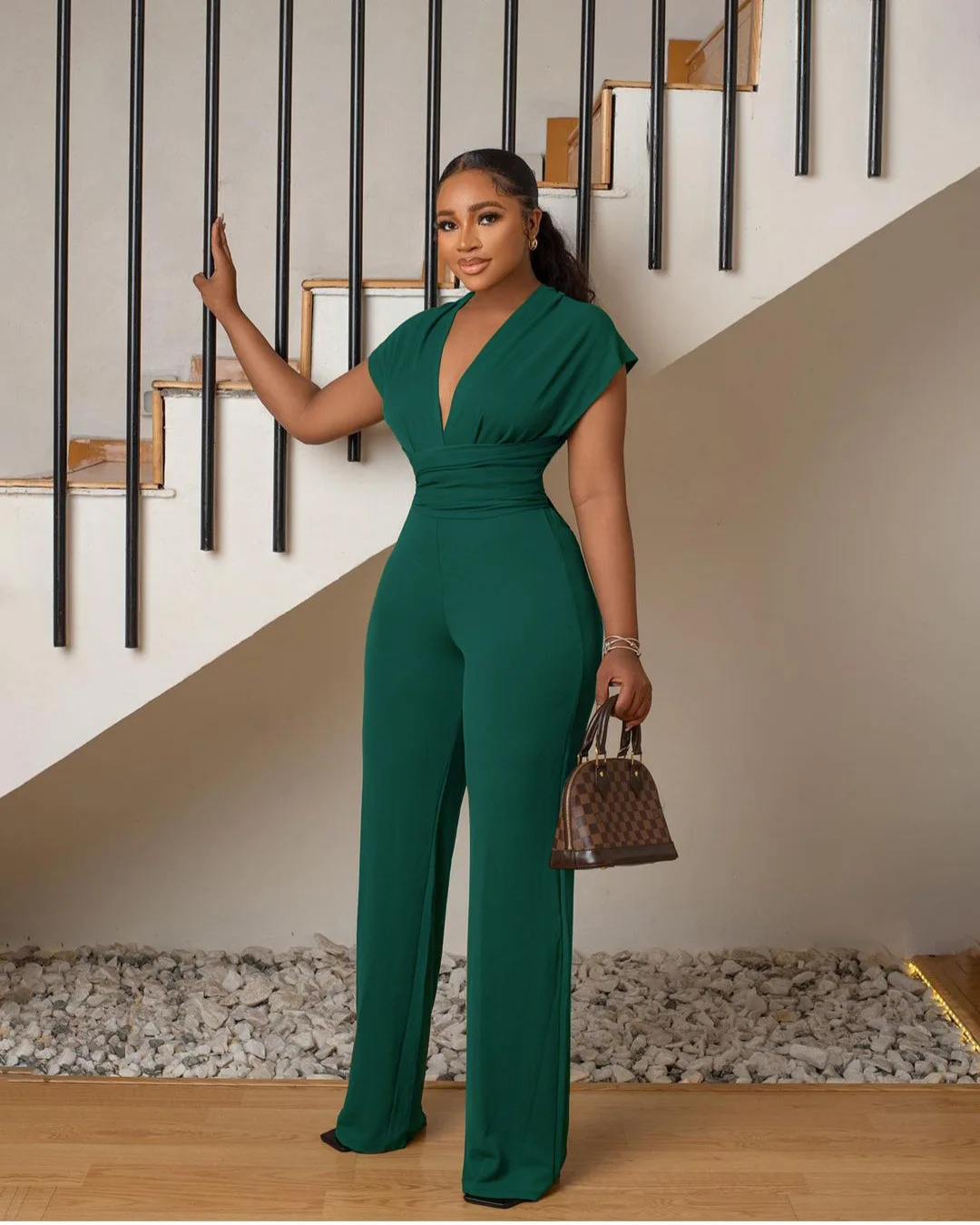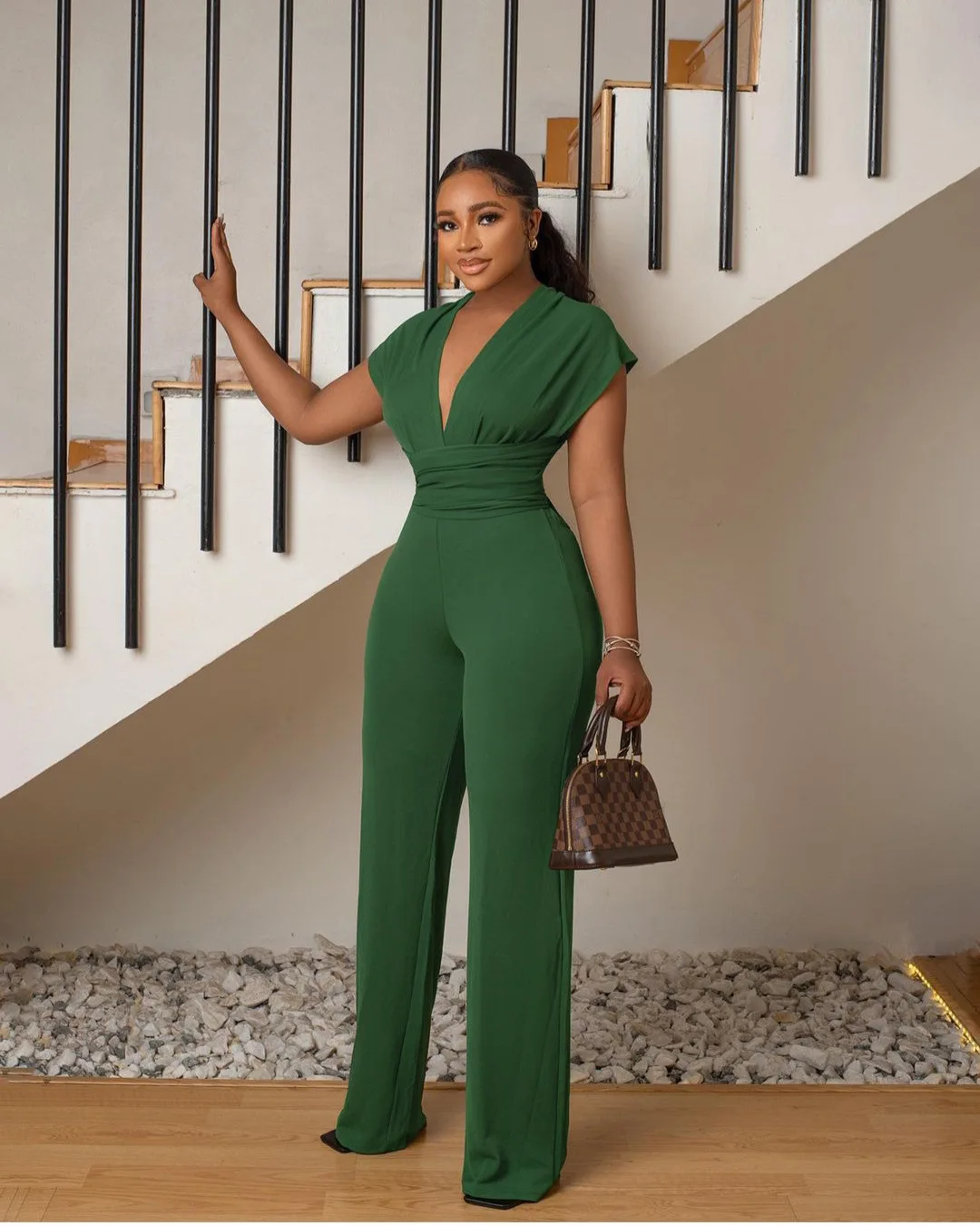 C240080 Elegant V Neck Lace up Jumpsuit Wide Leg Waisted Formal Jumpsuit Women