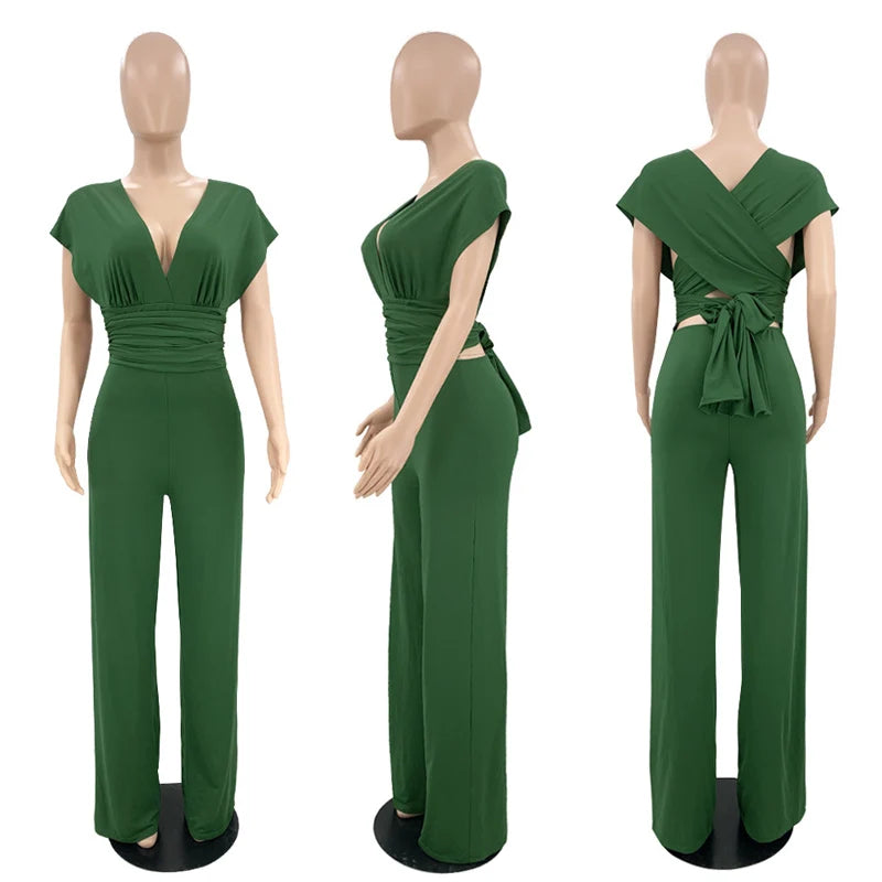 C240080 Elegant Cross Neck Lace Up Jumpsuit Wide Leg Waisted Formal Jumpsuit Women