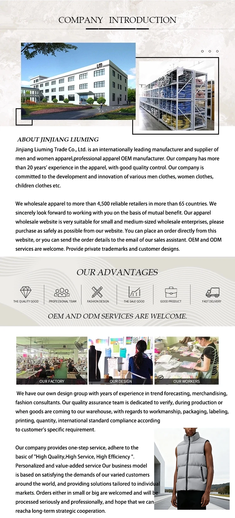 Q1:WHAT KIND OF SERVICE YOU ARE OFFERING? A1:We offer in stock items mostly. Q2: WHAT IS YOUR MOQ? A2: For in stock items MOQ is 1pcs each. Q3: WHAT IS YOUR LEAD TIME? A3: 3-7days Q4: CAN I ORDER SAMPLAS FIRST AND THEN PLACE THE BULK ORDER?? A4: Yes, we understand that customers want samples firstly, and then need a sales period to collect orders from their customers. This is not a problem; however, we will ask the customer for a small deposit of the bulk order. This deposit will be reimbursed when placing the bulk order. Q5: CAN I PUT MY OWN LABEL AND LOGO ON THE CLOTHES? A5: Yes, and you have two options: 1) Sending your label design to us and we make them for you, but you will need to meet our MOQ 2) Sending your finished labels to us and we put them on the clothes (free of charge), but you will need to meet our MOQ Q6: CAN YOU OFFER FREE SAMPLES? A6: Yes, but you have to pay first, it can be returned when the bulk order placed. Q7: CAN YOU OFFER FREE SHIPPING? A7: No. But we will choose the cheapest shipping way for you except you have special requirements.