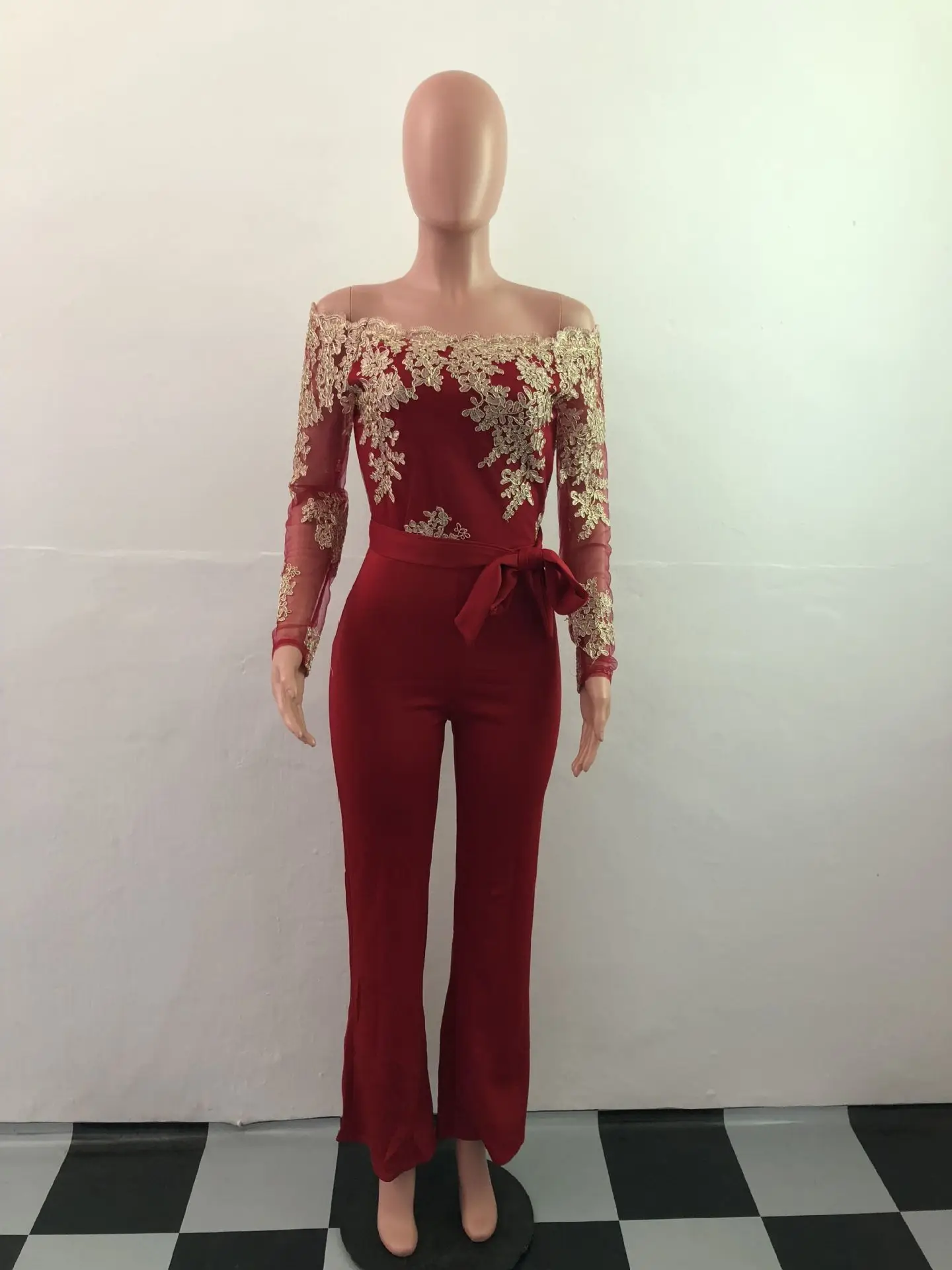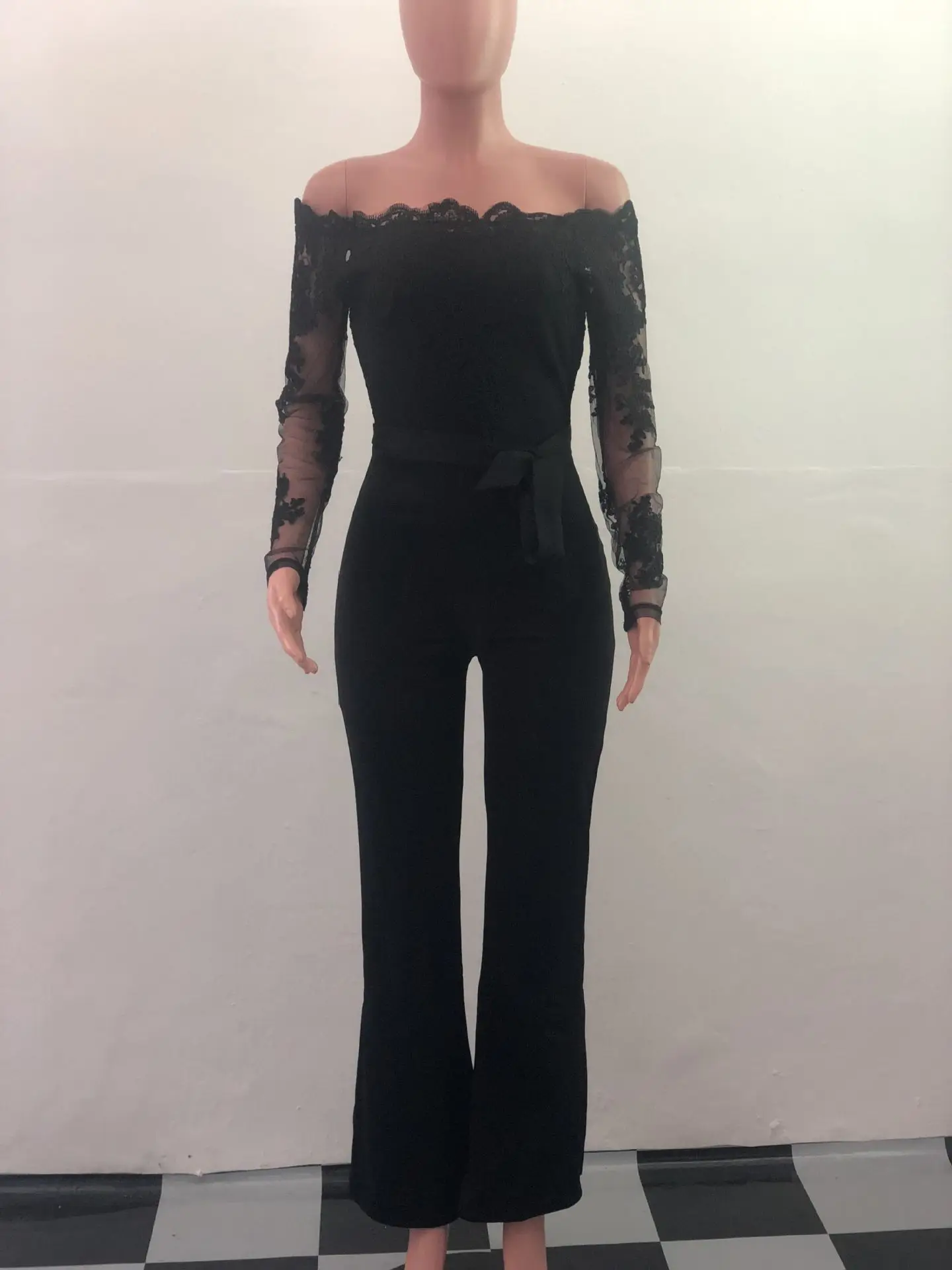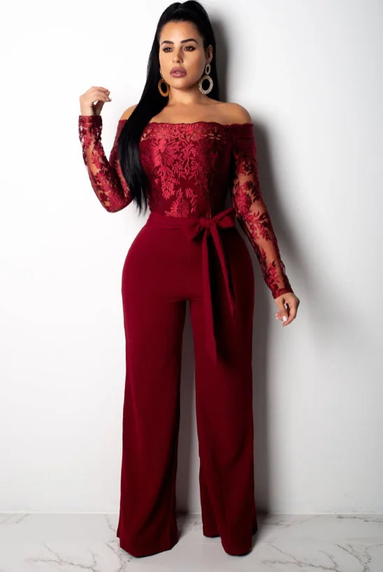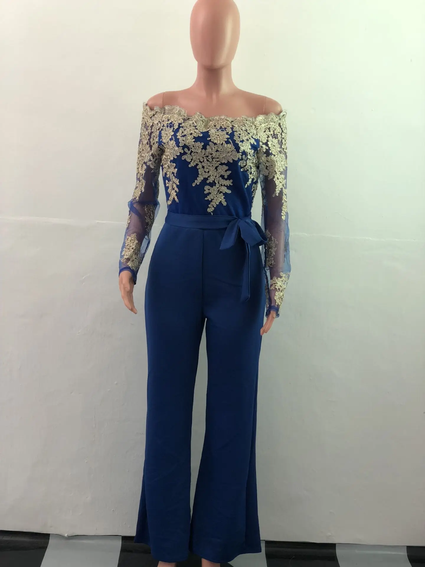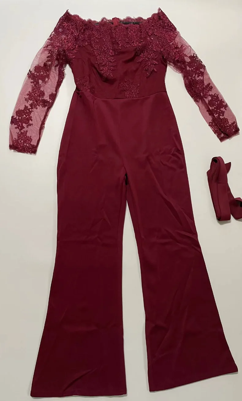 OEM ODM Women Clothing Elegant Overalls Off Shoulder Slash Neck Embroidery Lace Office Casual Jumpsuit-0