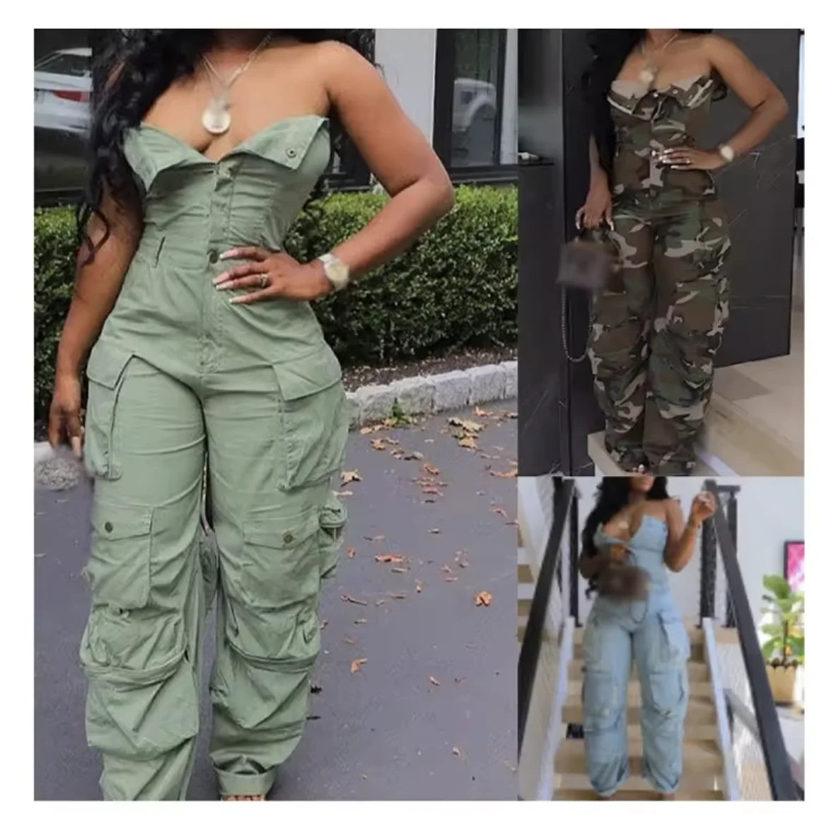Peeqi Fashion Streetwear Strapless Sleeveless Pocket Cargo Jumpsuits One Piece Romper Denim Jeans Sexy Plus Size Jumpsuit Women