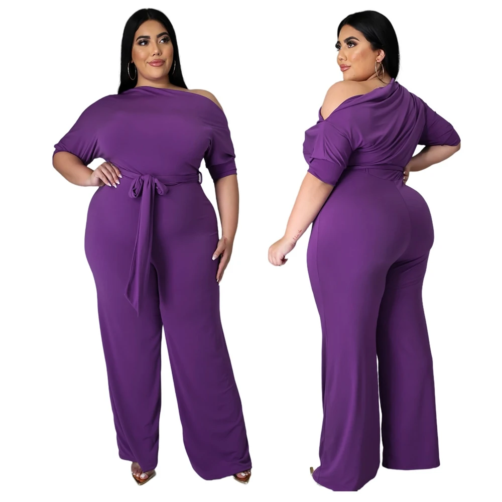 Plus Size Jumpsuit XL-4XL Bandage Rompers Women Clothing Autumn Solid Oblique Shoulder Plus Size Women's One Piece Jumpsuit-7