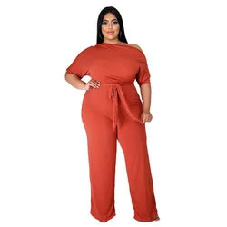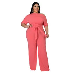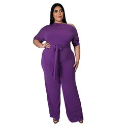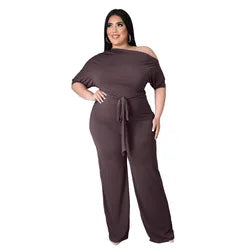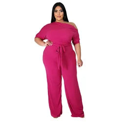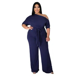 Plus Size Jumpsuit XL-4XL Bandage Rompers Women Clothing Autumn Solid Oblique Shoulder Plus Size Women's One Piece Jumpsuit-4