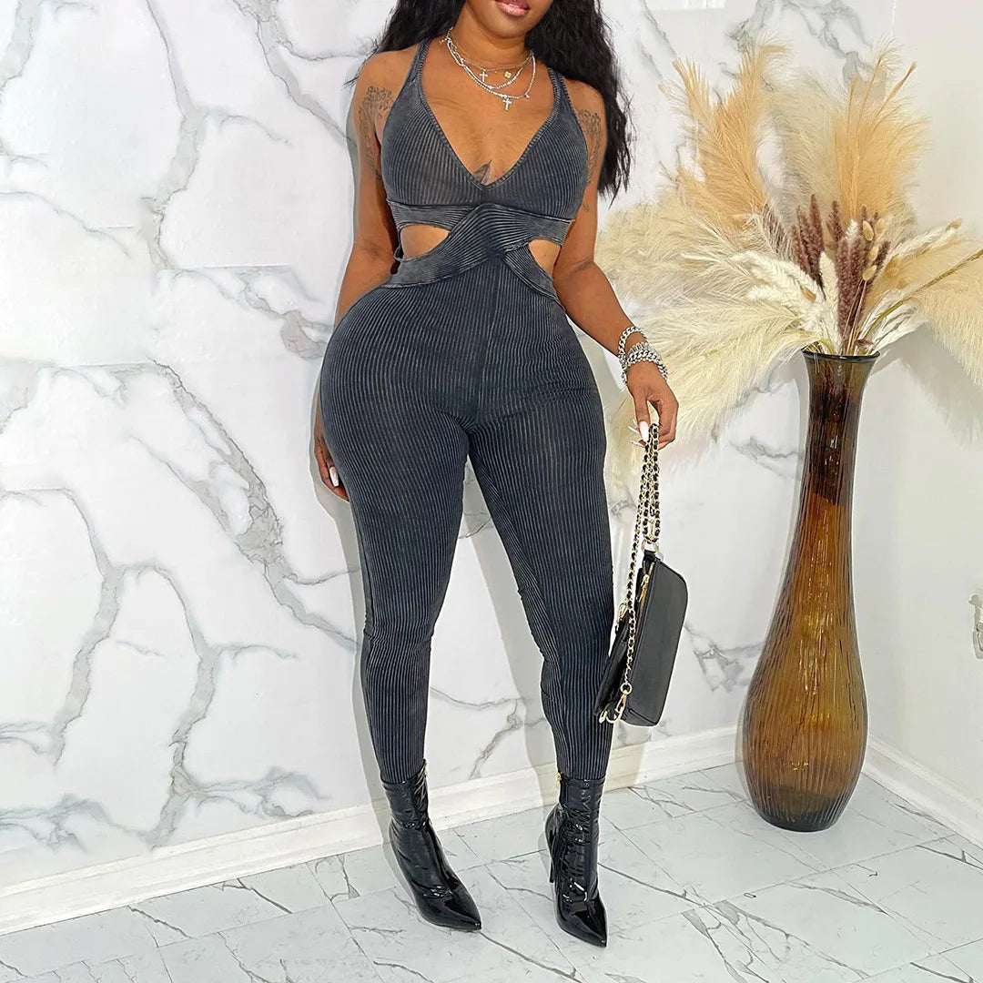Wholesale Summer Sleeveless Acid Wash Bodycon Jumpsuits Hollow Out One Piece Jumpsuit Women