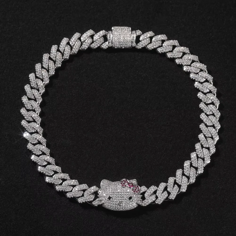 High Quality Iced-Out Moissanite Cuban Link Bracelet Cute Hello Kitty Brass Hip Hop Cuban Bracelet for Men Women