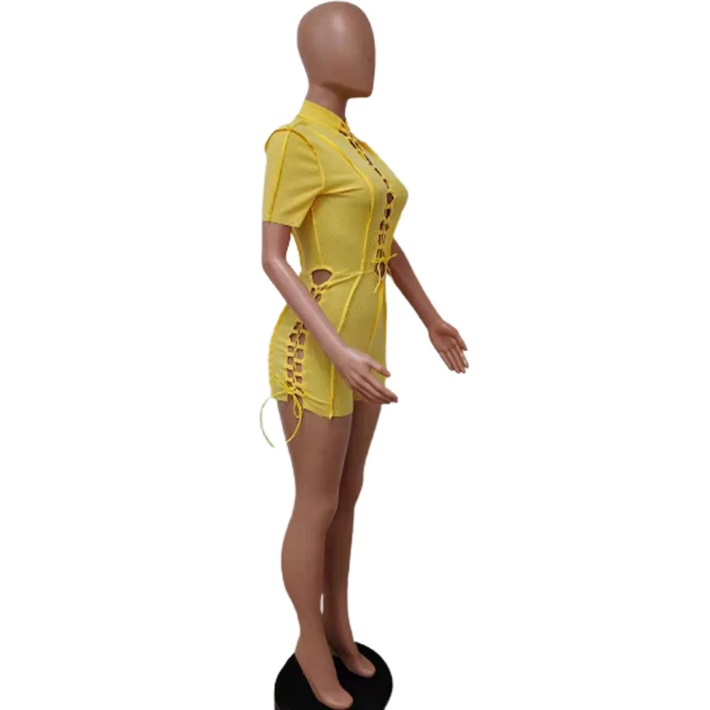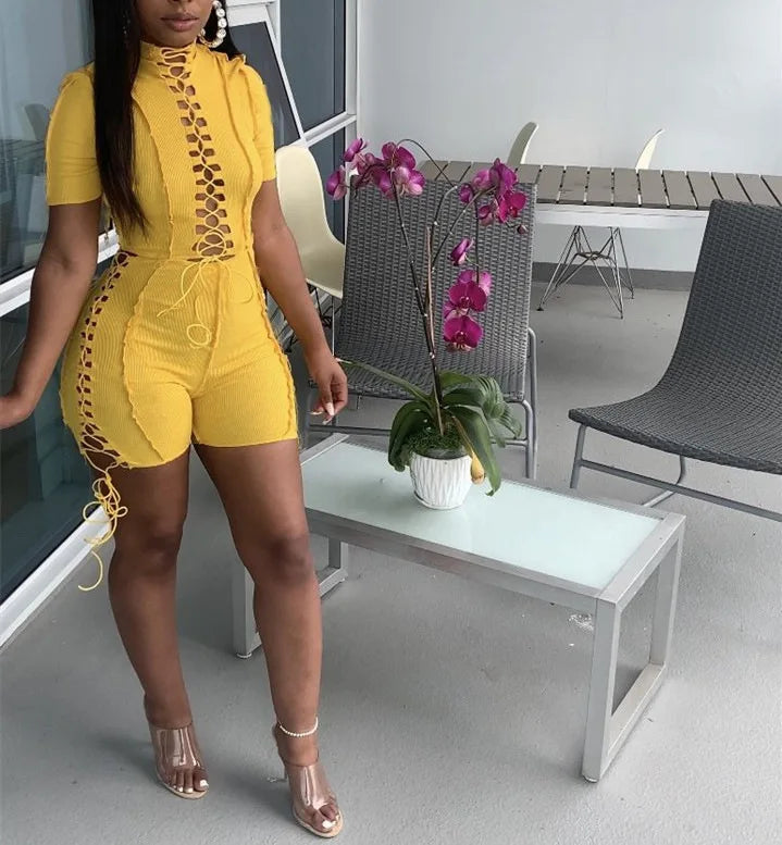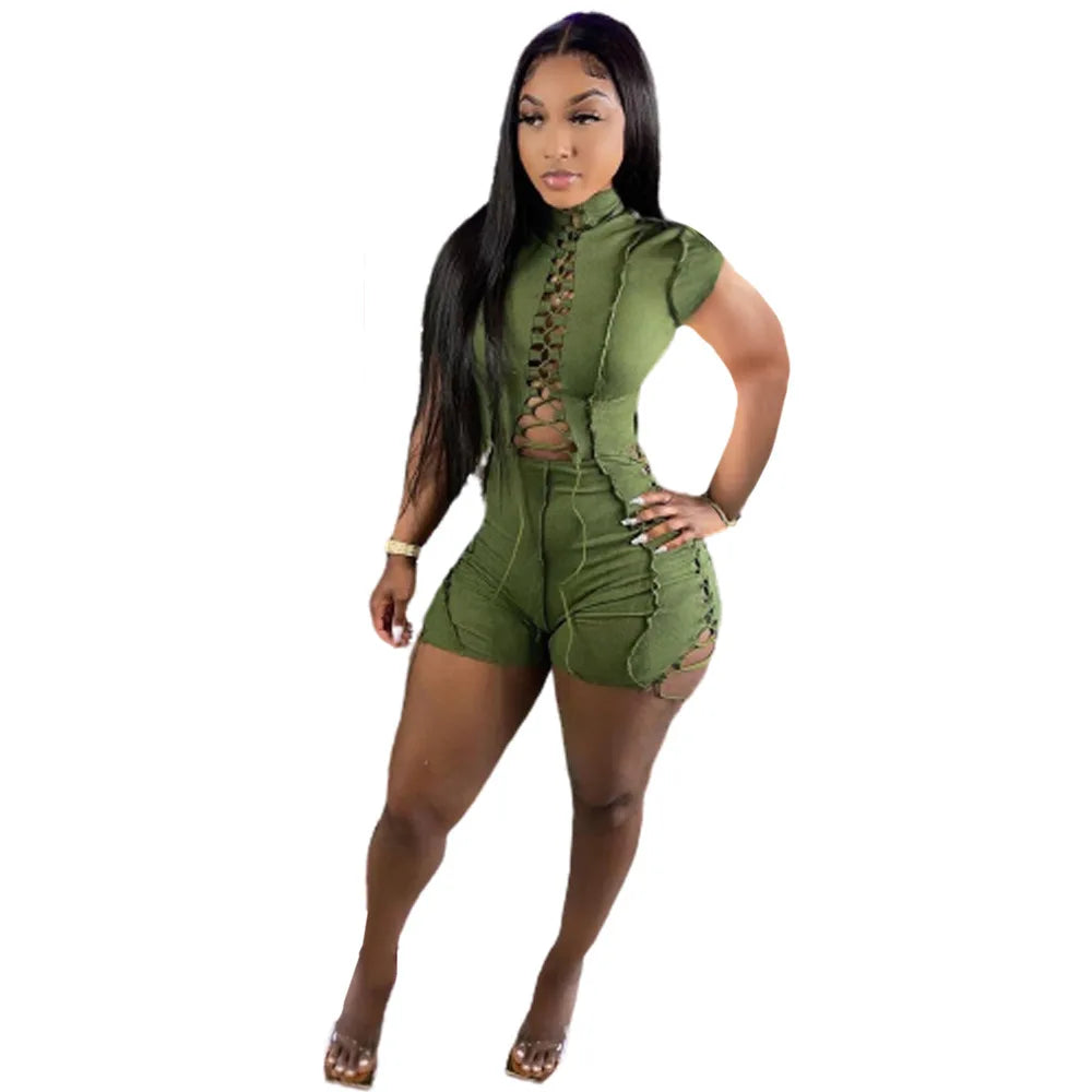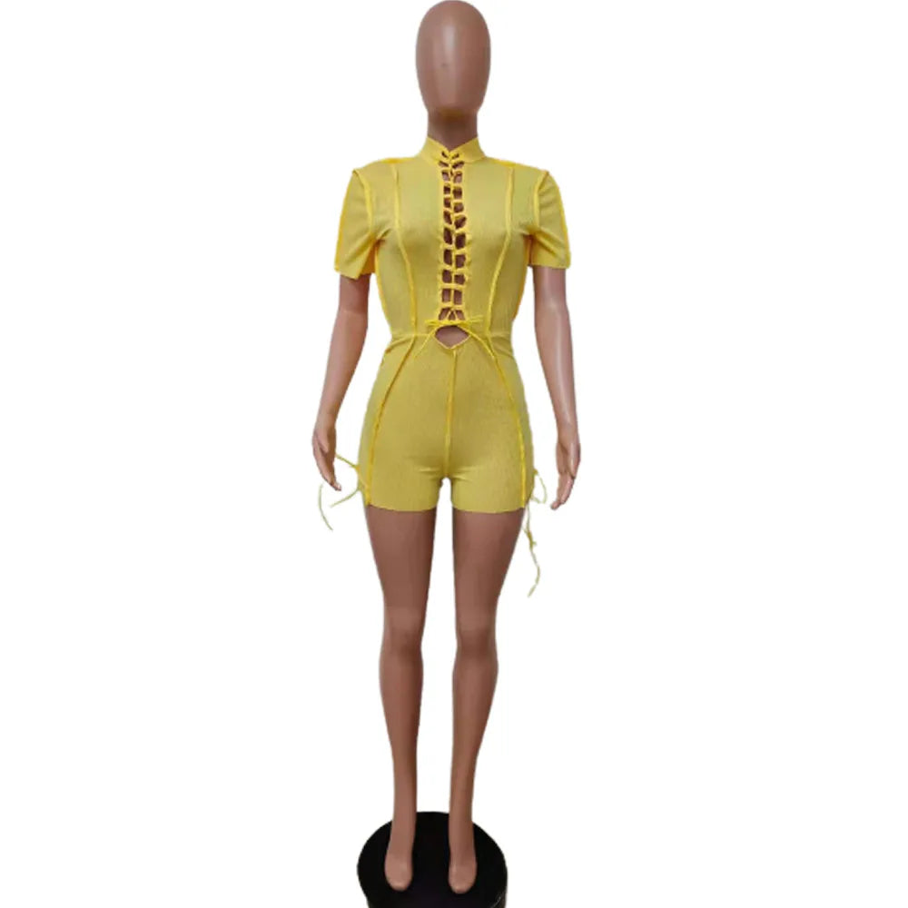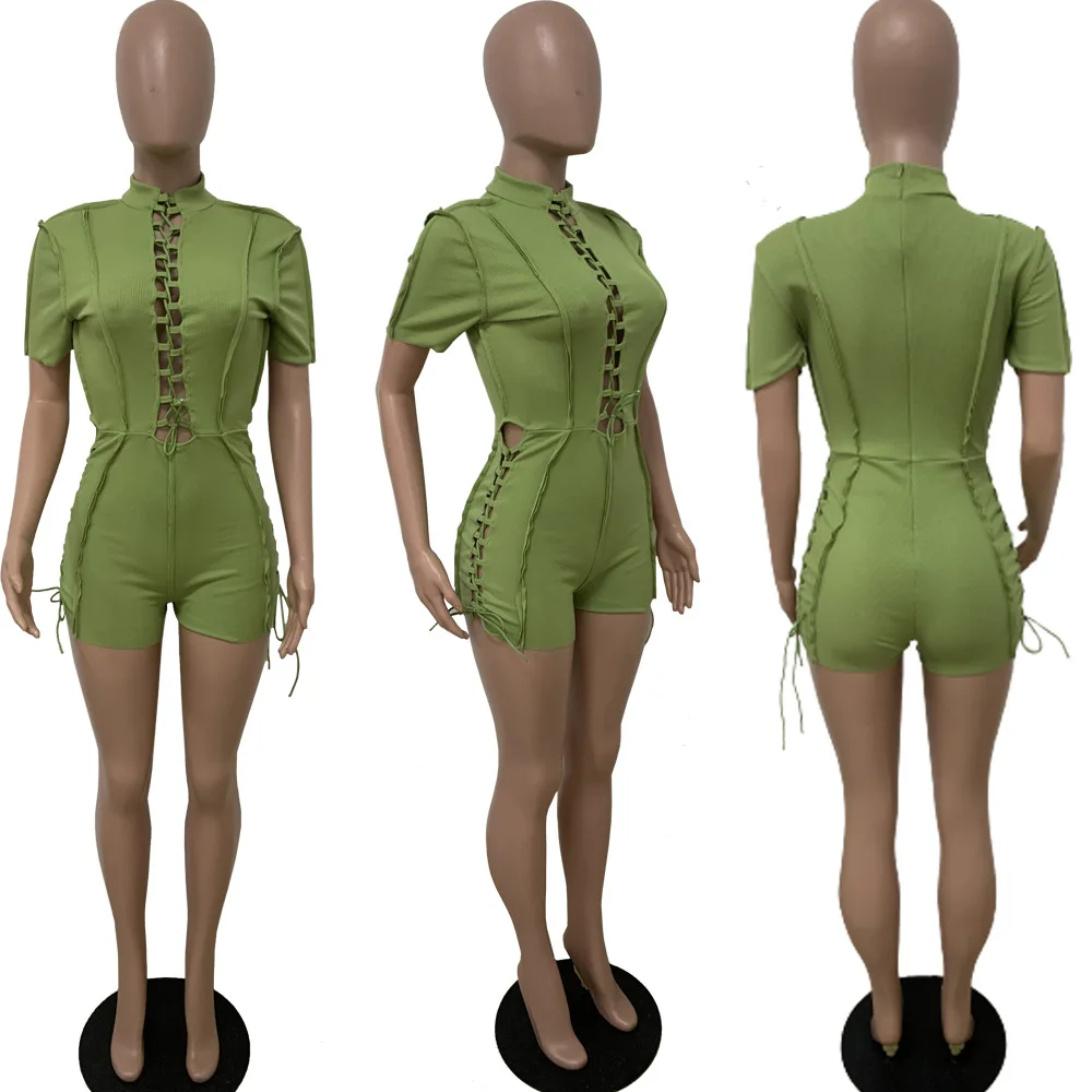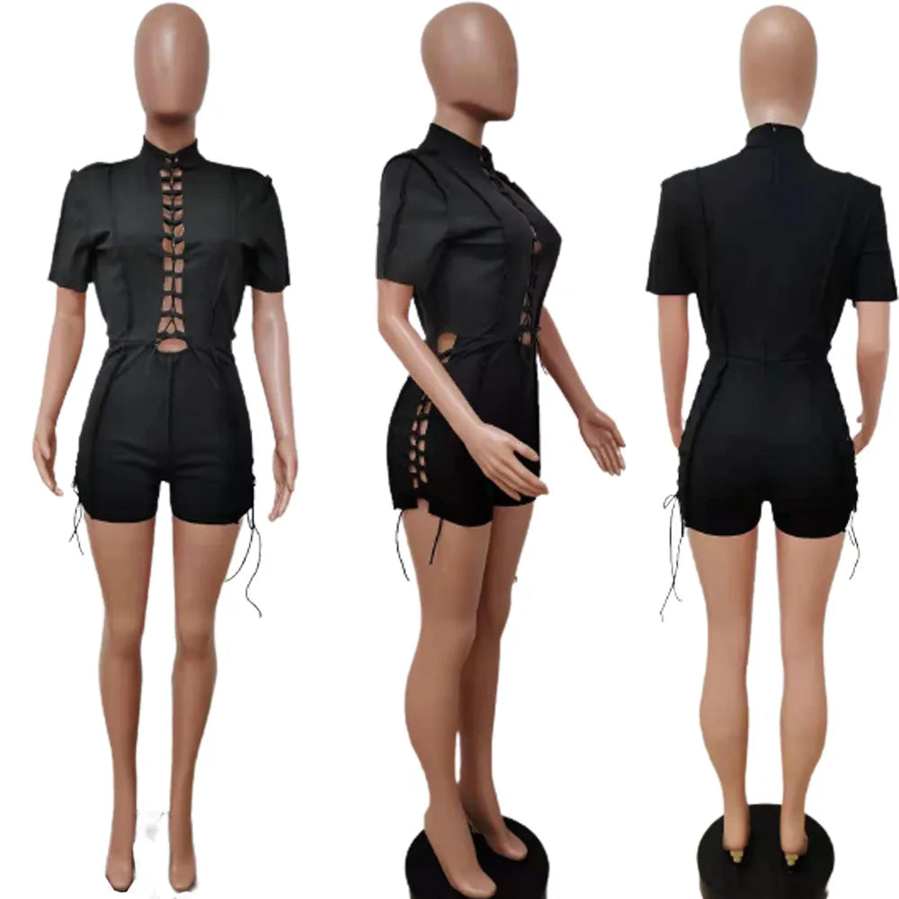 ANSKZTN Women Fashion Bodycon Solid O Neck Hollow Out Bandage Short Sleeve Rompers Jumpsuit