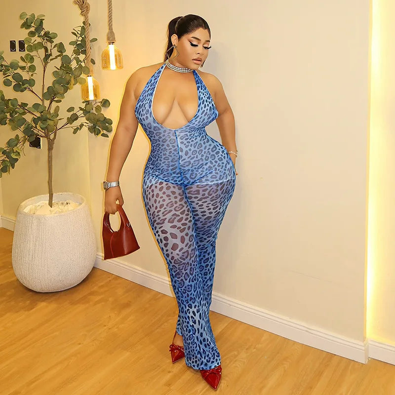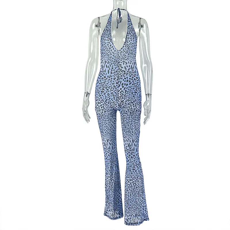 Sexy Halter Neck Deep v Neck Backless Leopard Printed Double Sheer Layer Women Skinny One Piece Casual Tight Bodycon Jumpsuits