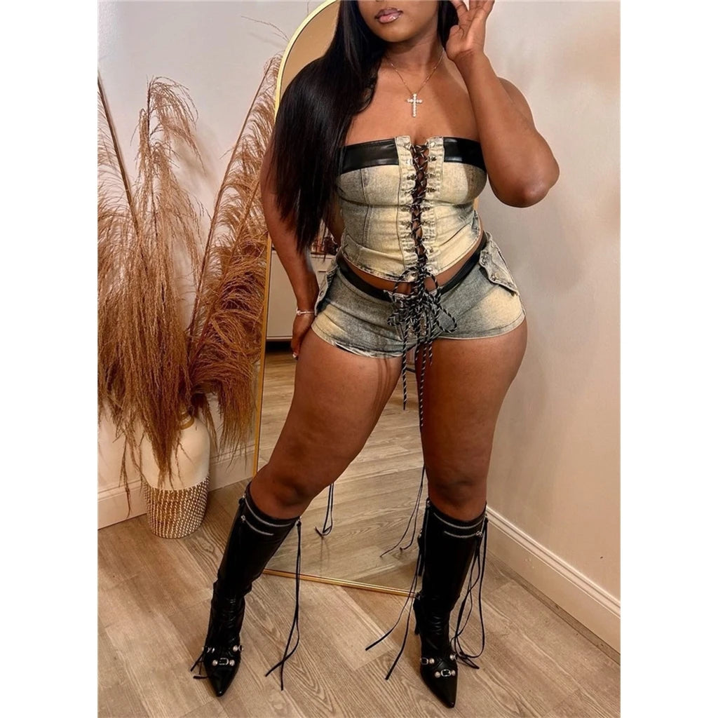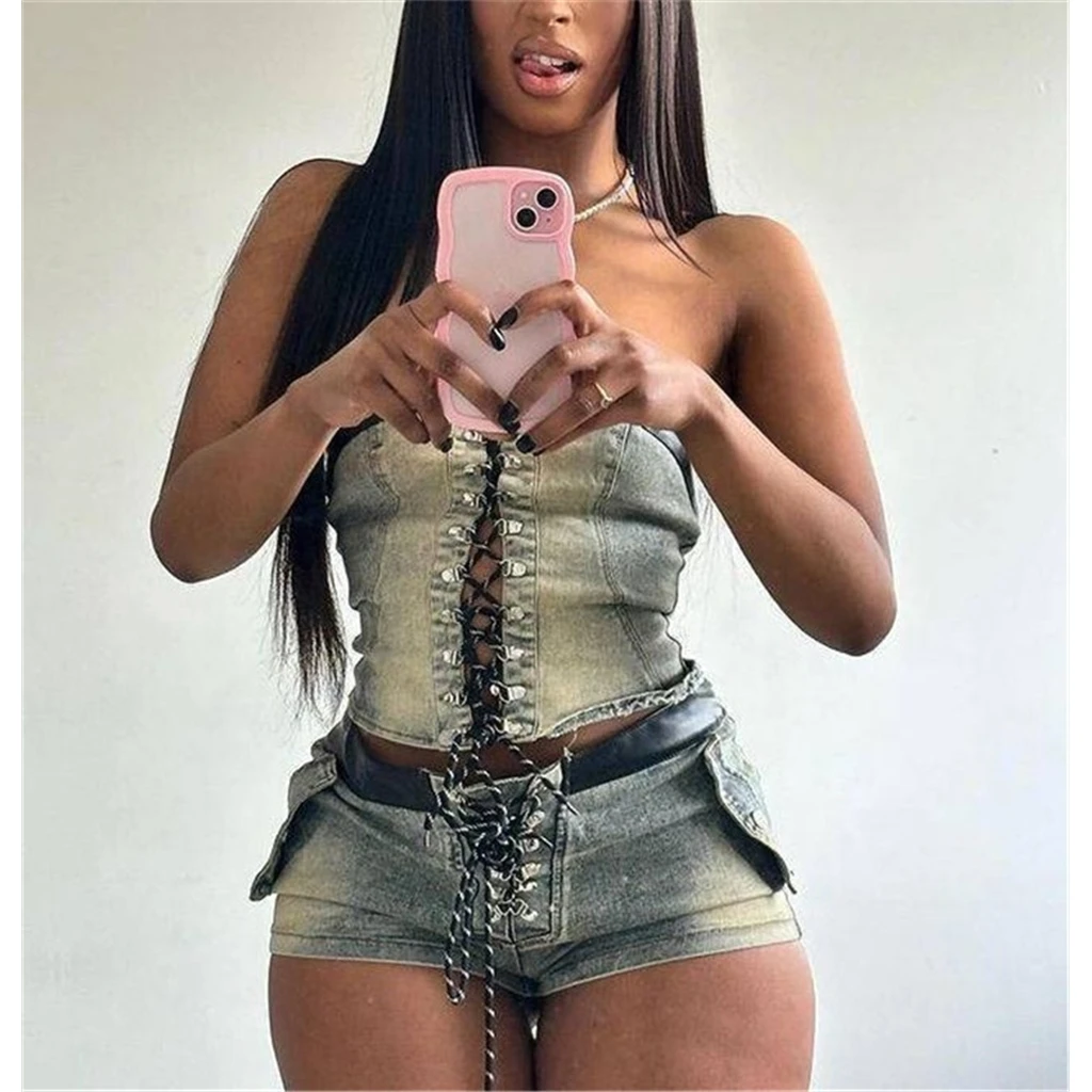 Stretch Denim Bandage 2 Piece Sets for Women Sexy Tube Tops and Shorts Matched 2024 Summer Street Safari Baddie Outfits