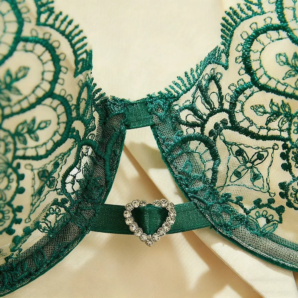 US Hot Sale Women Lingerie Set Green Exotic Lace Bra Brief Set Bow Collar Sexy Floral Print Lingerie Spandex Set-6