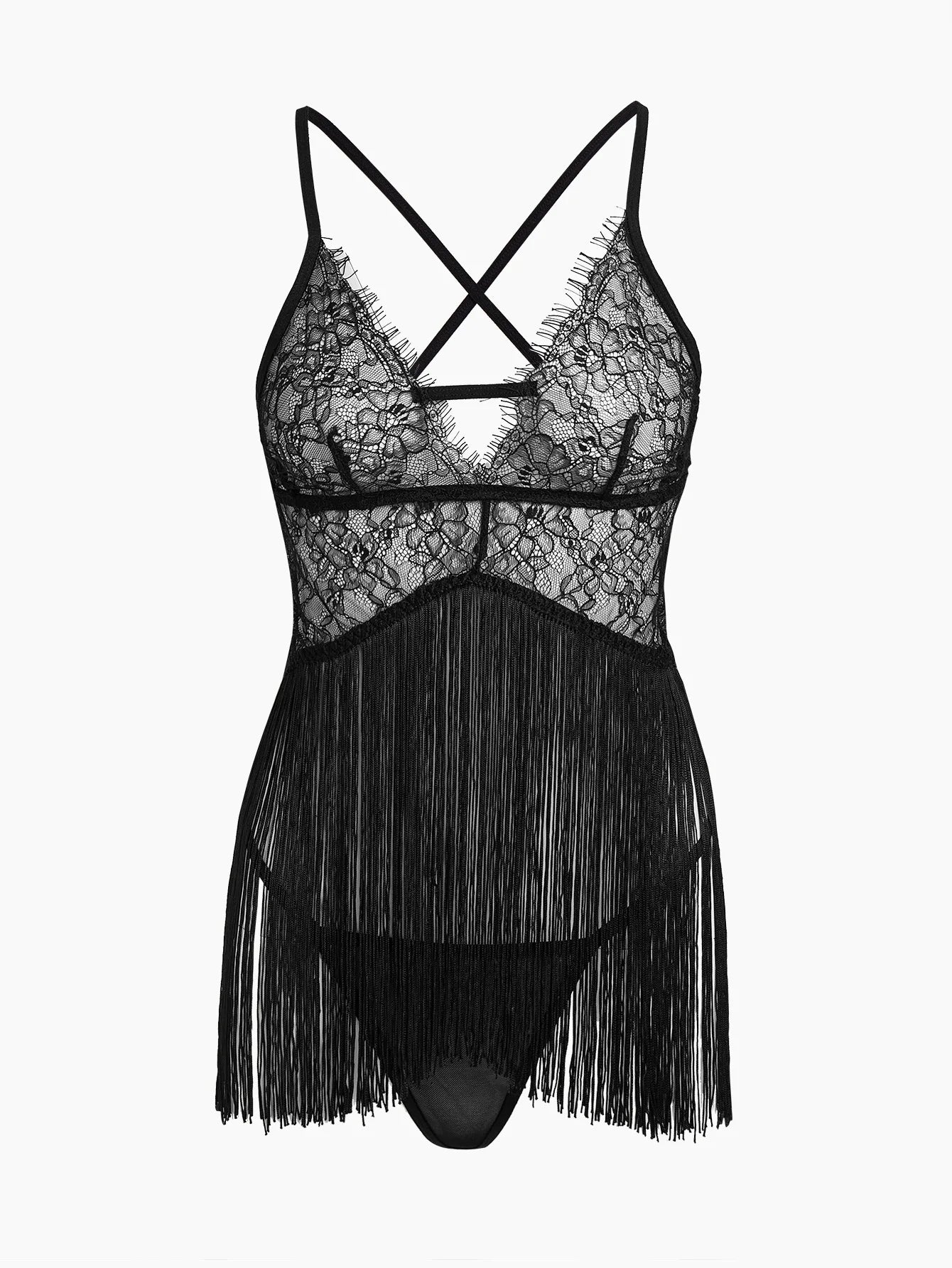 Sexy Women's Exotic Dress Seductive Lace Halter Hollow Chest 2PC Backless Split Mini Dress Chains Tassel Club Dance Lingerie-1