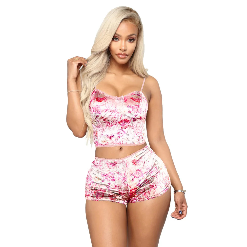 Women's Casual Style Slim Velvet Pajamas Above Knee Two Piece Shorts Set Sexy Print Club Wear